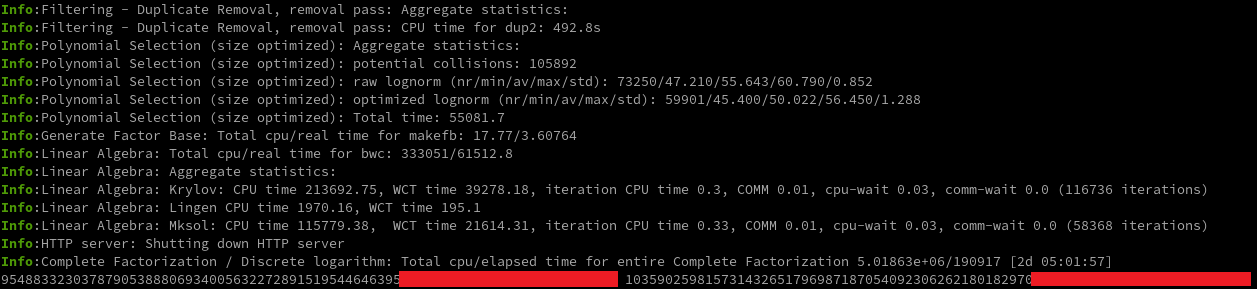 glibcversion compatibility issues.Pay attention to the output after CADO-NFS server starts up, which will contain a command for restoring progress, this is quite useful if the server accidentally exits.